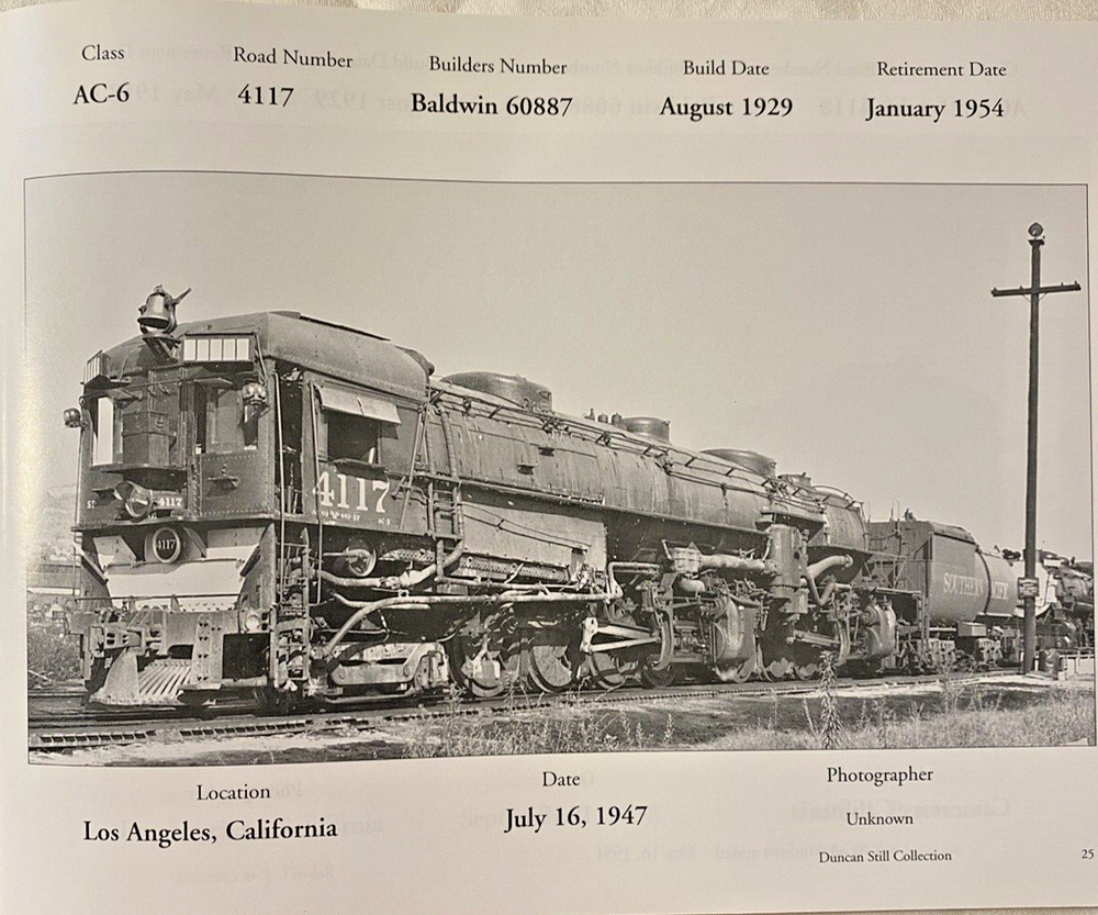 Southern Pacific AC-1 to AC-3 Class 2-8-8-2, AC-4 to AC-12 Class 4-8-8-2 Cab Forward, souther Pacific Steam series Volume 32 is a book published in 2005 in the United States. It is part of a pictorial series focusing on Southern Pacific Railroad. The book contains photographs and information about the locomotive, providing a detailed look at its history and operations within the Southern Pacific Railroad system. This collectible item is a valuable resource for enthusiasts and historians interested in railroadiana and trains from the 20th century. Each page features a stunning black and white photograph of a steam locomotive with information including model number, road number, build number, build date, retirement date, location of the photograph, date of photograph and photographer.