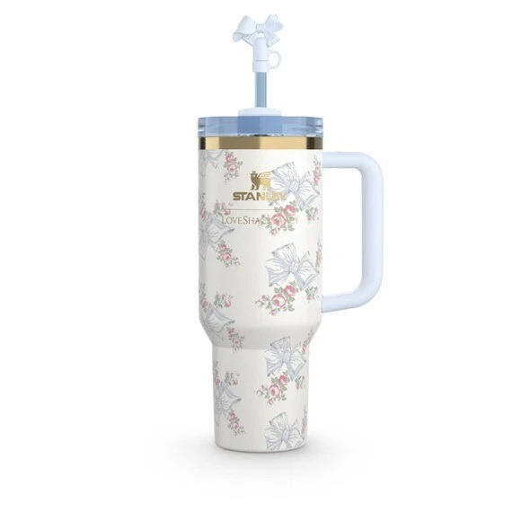 The original oversized bow that sparked LoveShackFancy’s love for the flourish in all areas of its rose-colored world is shown in its signature blush pink and gentian blue. Romance returns with LoveShackFancy’s signature oversized bows. With intricate patterns and gilded accents, the Quencher is ready to sip fancy and festive this holiday season. 18/8 recycled stainless steel Double-wall vacuum insulation FlowState™ 3-position lid Reusable straw Car cup holder compatible Dishwasher safe BPA-free New in box unopened