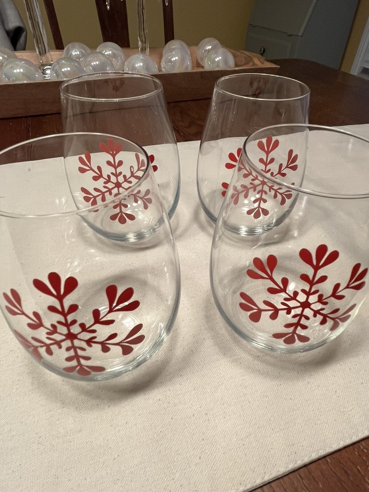 These cute wine glasses are perfect for the holidays. Please note snowflake on 2 glasses are slightly worn. Please see pics for accurate representation of condition. Stored in a smoke free, pet free home.