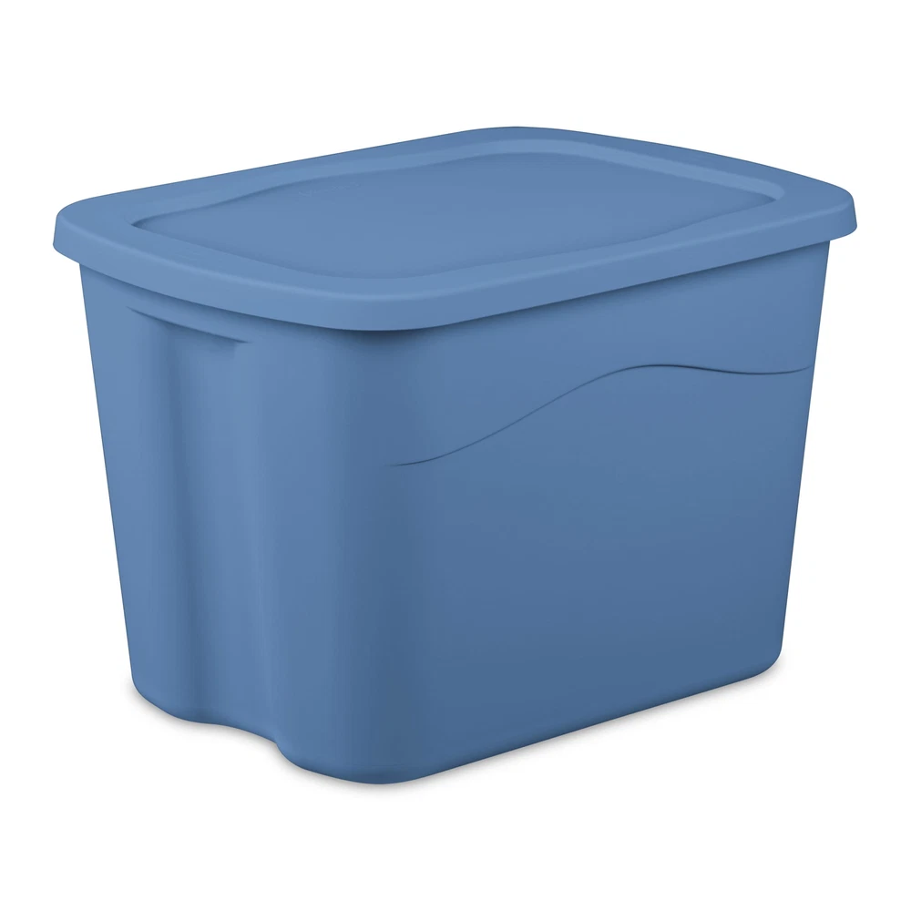 The Sterilite Medium 18 Gallon Storage Bin with Lid is a popular sized plastic tote that lets you organize for less! Integrated handles allow you to carry the tote to where it needs to go, while the snap-on lid conceals contents and allows you to stack totes to save space. This popular sized tote can help contain clutter and bring order to closets, bedrooms, and dorms. Classic styling and value make this perfect for your basic household storage needs. Note: Use good judgment when storing items, don’t overload, keep heaviest bin at bottom, and don’t stack too high. The overall assembled dimensions of this item are 22 5/8" L x 17 1/4" W x 15 1/2" H. Sterilite Medium Tote, 18 Gallon Plastic Storage Bin with Snap-on Lid, Light Blue, 8 Count Outside Dimensions: 22 5/8" x 17 1/4" x 15 1/2" Interior Dimensions at bottom: 17" x 13" x 15" Snap-on lids conceal contents and are recessed to allow for stacking Integrated handles for lifting and carrying Home organization at a value, ideal for bedrooms, closets and dorm rooms Use good judgment when stacking items, keep heaviest bin at the bottom BPA-free and phthalate-free