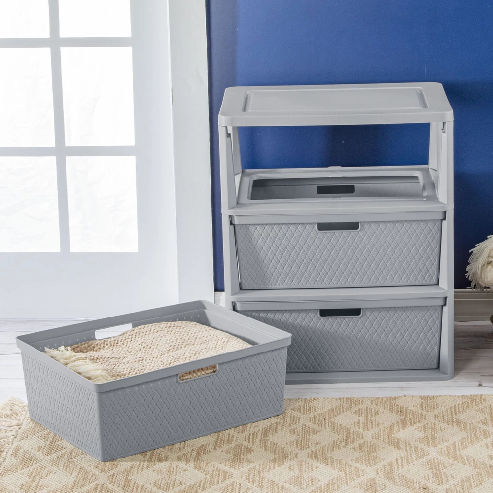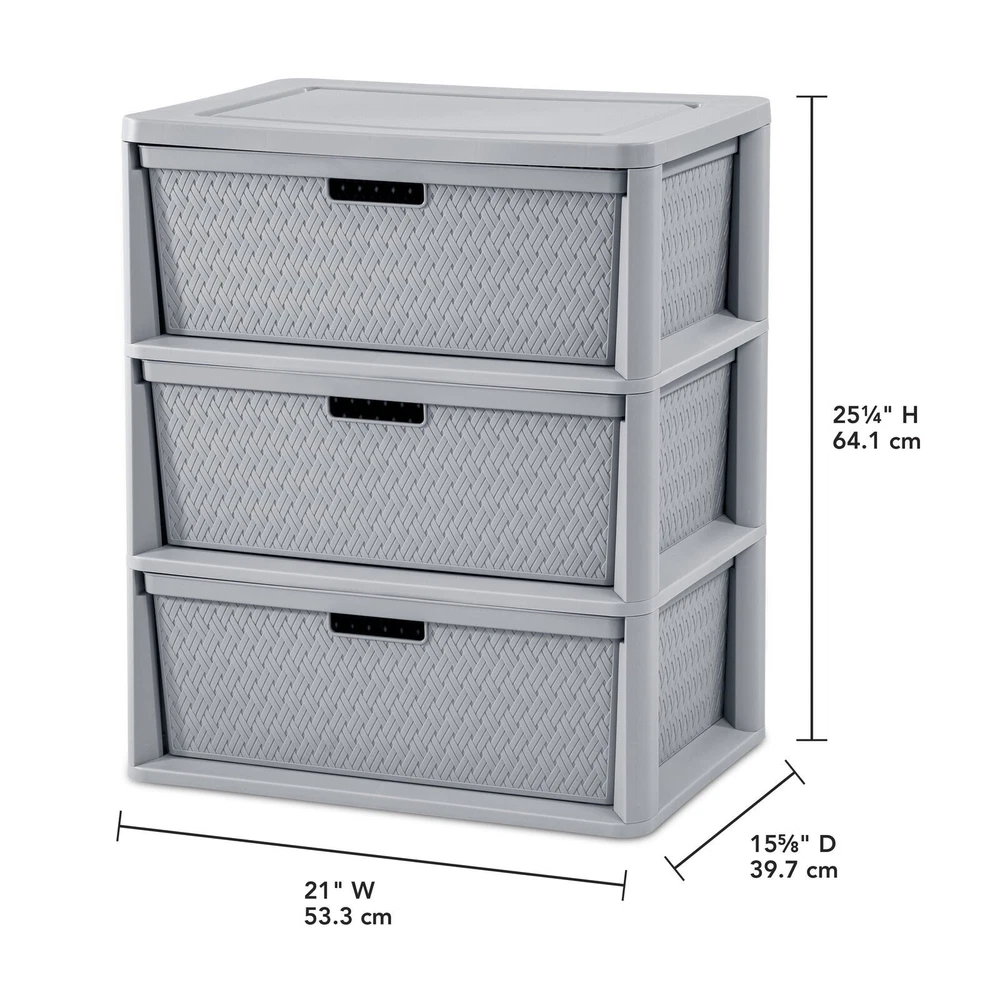 Sterilite Adult Plastic Wide 3 Drawer Cross-Weave Tower Cement: Outside Dimensions: 15 5/8" x 21" x 25 1/4" Single unit option Cement Interior Dimensions at bottom: 18" x 13 3/4" x 7" Timeless and stylish cross-weave pattern in a multi-purpose and versatile storage option for any room in the home Each drawer can become a portable bin by simply removing from frame The integrated carry-through handles allow the bin to be carried with ease Opaque drawers keep contents concealed and clutter controlled Designed with a drawer stop so the drawer will not unintentionally fall out Assembles easily in minutes, without the use of tools BPA-free and phthalate-free On Nov 21, 2024 at 02:27:55 PST, seller added the following information: