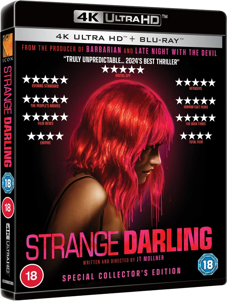 Further Details Title: Strange Darling Collector's Edition Condition: New No Of Discs: 2 Format: 4K UHD Blu-ray Description: A clever and relentless thrill ride that defies audience expectation at every turn, in Strange Darling, nothing is what it seems when a twisted one-night stand spirals into a serial killer’s vicious murder spree. A fascinating new horror-thriller from the producers of 'Late Night with the Devil' and 'Barbarian', this flawlessly constructed fresh take on the cat-and-mouse genre stars Willa Fitzgerald (Reacher, Scream series), Kyle Gallner (Smile, 2022 Scream), Ed Begley Jr. (Better Call Saul, A Mighty Wind), and Barbara Hershey (Black Swan, Insidious, The Last Temptation of Christ). "A clever masterpiece" STEPHEN KING ★★★★★ "The rush of blood you’ve been screaming out for" EVENING STANDARD ★★★★★ "2024's best thriller" DIGITAL SPY ★★★★★ “The most exciting genre movie of the year” HEYUGUYS ★★★★★ "Electrifying" DEXERTO ★★★★★ “Insanely addictive and hideously entertaining” THE PEOPLE’S MOVIES ★★★★★ “Astonishing” FILM NEWS ★★★★★ “Brilliant… Great characters, great performances, great cinematography and breakneck pacing” HORROR CULT FILMS ★★★★ "A slick game of cat-and-mouse" TOTAL FILM Studio: Icon Film Distribution Actor: Barbara Hershey, Ed Begley Jr., Kyle Gallner, Madisen Beaty, Willa Fitzgerald, Steven Michael Quezada, Duke Mollner, Bianca A. Santos, Eugenia Kuzmina, Denise Grayson Director: JT Mollner Run Time: 97 minutes Region Code: Region A