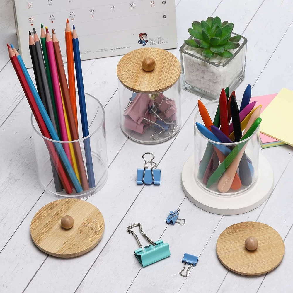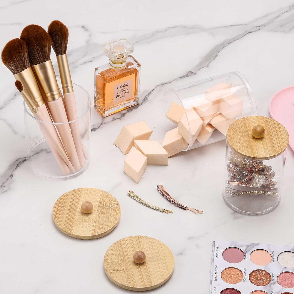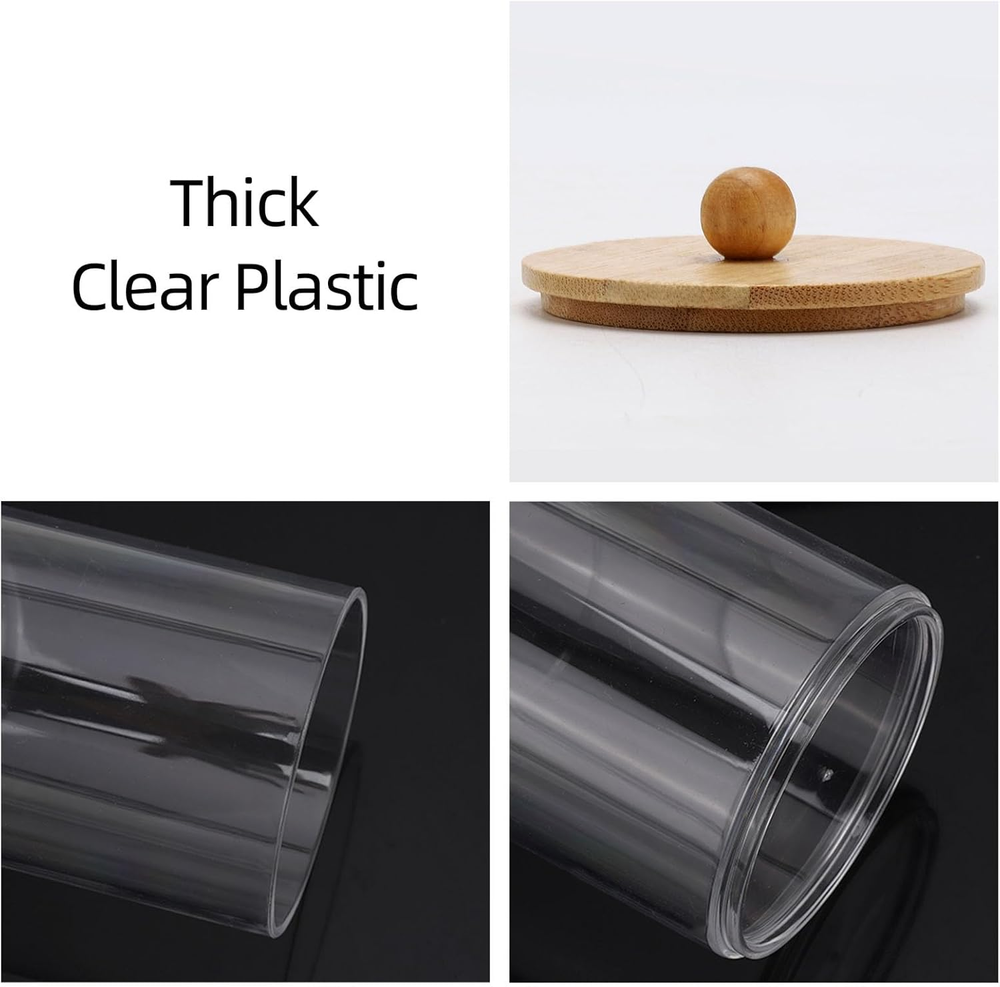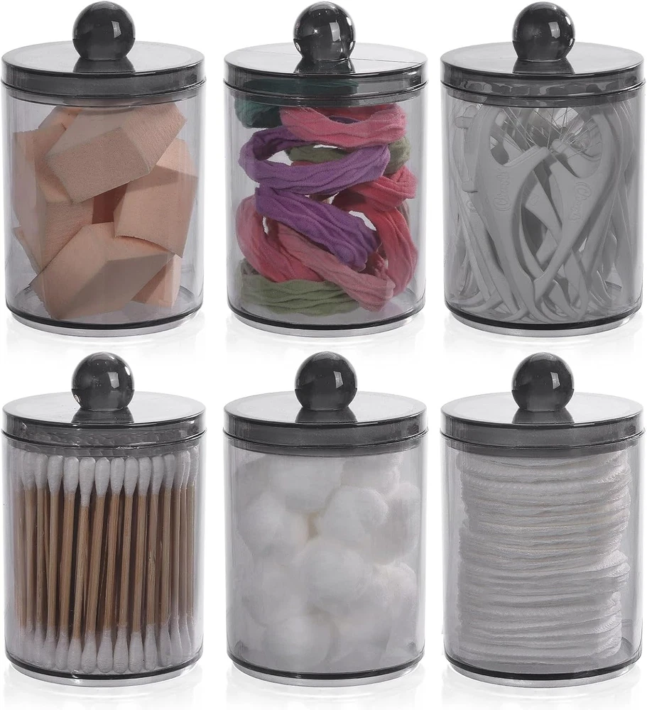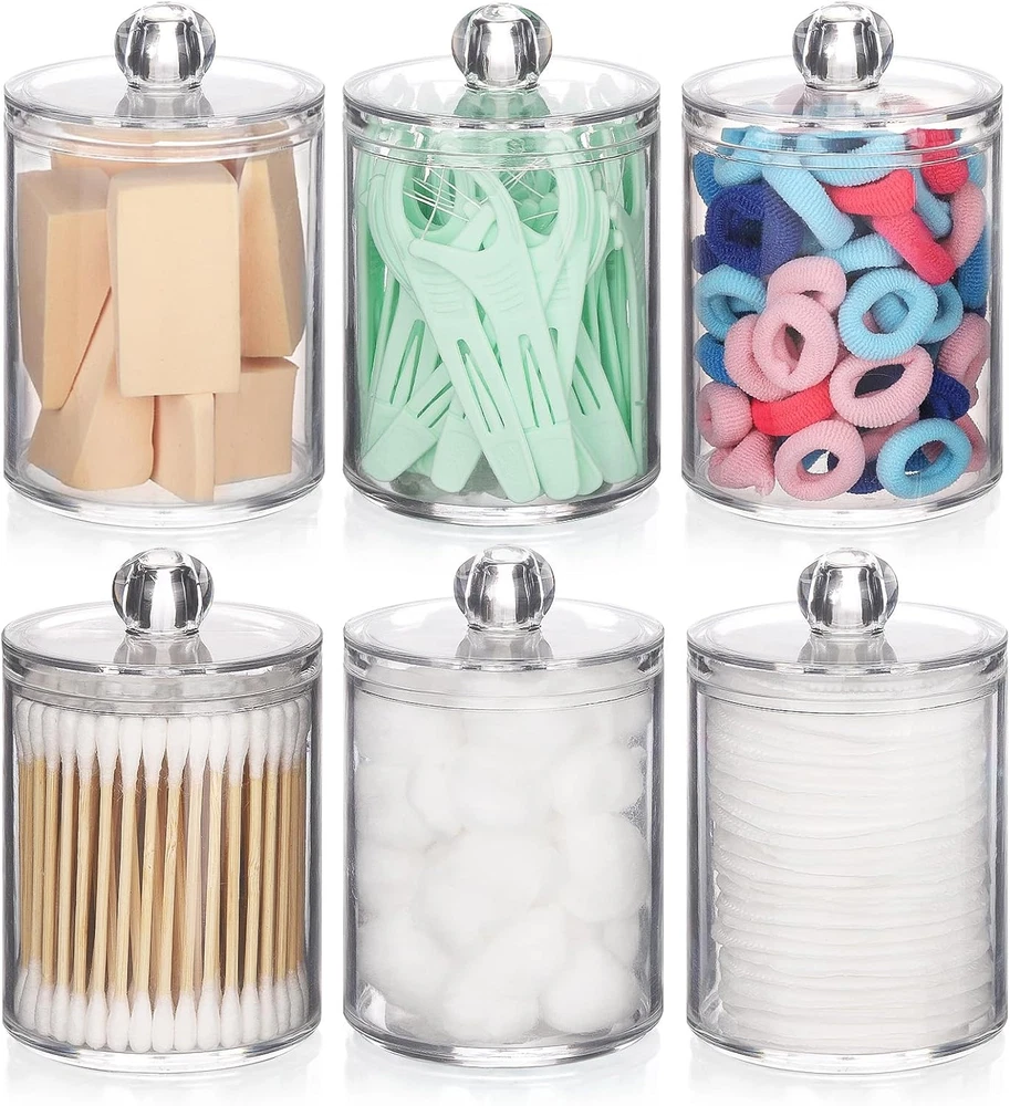 Bathroom Containers - bathroom organizer canisters whit lids are JUST RIGHT for Q-tip, cotton ball, cotton swab, cotton rounds, floss picks, tampon, bath salts, hair tie band, makeup brush, beauty egg, face brush, crayons, candy, pens, clip and more small things Wide Mouth Design - Each qtip holder has a removable lid and a wide mouth, easy to set the Q-Tips perfectly in the dispenser and easy to get them out Waterproof and Moisture-proof - Bathroom jars with lids are sturdy & tight, you keep the apothecary jars in the bathroom and the cotton won't fluff from moisture BETTER DECOR STYLE - Thick clear plastic vanity organizer are good decor elements, modern farmhouse style, very suitable for office and home, restroom, vanity countop, bedroom, kitchen and bathroom decor Bathroom Jars can be used to keep things organized and make it easier to find what you need, 3 pack 10oz, 3 pack 12oz 6 Pack Qtip Holder - 12oz 10oz Plastic Bathroom Containers with Bamboo Lids for Cotton Ball, Cotton Swab, Cotton Round Pads, Floss - Clear Restroom Organizers and Storage Containers (Beige)