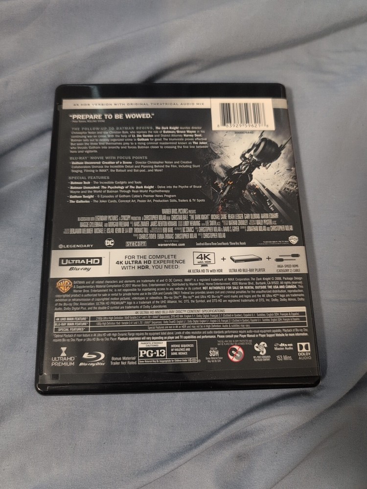 Studio:Warner Home Videogtin13:0883929596218Format:Ultra HDMovie/TV Title:The Dark KnightGenre:Action & AdventureRelease Year:2008Features:WidescreenDirector:Christopher NolanProducer:Charles Roven, Christopher Nolan, Emma ThomasRating:PG-13UPC:0883929596218Type:Movie