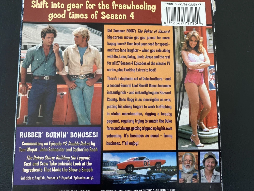 Region Code:DVD: 1 (US, Canada...)Country/Region of Manufacture:United StatesType:TV SeriesRun Time:1316 Mins.Season:4Edition:Box SetActor:John SnyderRelease Year:2005gtin13:Does not applyUPC:Does not applyLanguage:EnglishFormat:DVDCase Type:Cardboard SleeveStudio:Warner BrosGenre:AdventureMovie/TV Title:The Dukes Of HazardRating:PGSub-Genre:Family