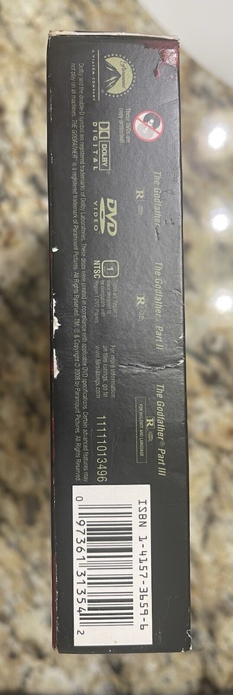 This comprehensive DVD box set of "The Godfather" trilogy, featuring all three films and bonus supplements, is a must-have for fans of the iconic mafia franchise. The Coppola Restoration edition features action, adventure, drama, and gangster genres, with notable performances by Al Pacino, Diane Keaton, and Marlon Brando. The cardboard sleeve shows minor signs of wear, but the discs are in great condition.
