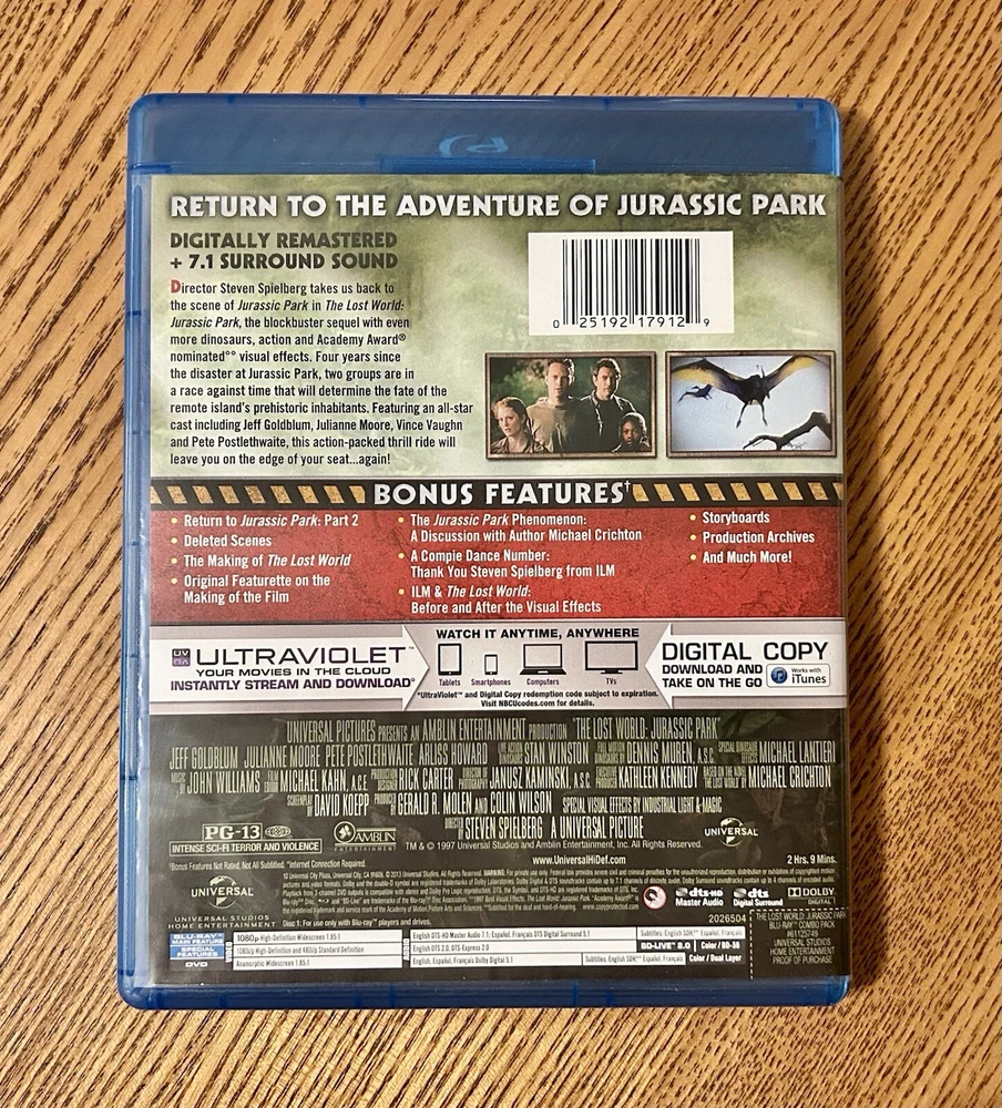Immerse yourself in the breathtaking world of Jurassic Park with this deluxe edition Blu-ray/DVD 2-disc set of "The Lost World: Jurassic Park." Directed by Steven Allan Spielberg, this cinematic movement cult classic is rated PG-13 and features English, French, and Spanish subtitles. The movie is produced by Gerald R Molen and Colin Wilson, with an aspect ratio of 16:9 and a release year of 2013. This Blu-ray/DVD set comes in a Blu-ray case and includes commentary, a book, full screen, retrospective interviews, behind the scenes featurette, additional scenes, captioned, widescreen, deleted scenes, and with subtitles. The movie features Julianne Moore and Jeff Goldblum, and is a must-have for fans of the Jurassic Park franchise.