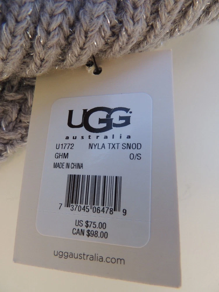 UGG NYLA TEXTURED METALLIC SNOOD SCARF, ONE SIZE ~NEW WITH TAGS WOMEN/S ONE SIZE COLOR: GREY HEATHER METALLIC ~ RETAIL $ 75 UGG LOGO ON THE BOTTON UGG LOGO TAB LABEL ON THE INSIDE WOOL,ACRYLIC, NYLON ~ PLEASE SEE THE PICTURES FOR MORE DETAIL. Please note, None of the UGG products are made in Australia I BUY ALL MY ITEMS FROM THE UGG PARENT COMPANY ( DECKERS).YES, DECKERS OWNS UGG AND IS LOCATED IN MY HOMETOWN! I HAVE SOLD OVER 20000 PAIR OF AUTHENTIC UGG'S, BUY WITH CONFIDENCE PLEASE SEE MY OTHER LISTINGS, I OFFER COMBINED SHIP DISCOUNT INTERNATIONAL BIDDERS , BUYER IS RESPONSIBLE FOR ANY POSSIBLE CUSTOMS FEE'S ( TAXES BY YOUR COUNTRY) . PLEASE CHECK WITH YOUR LOCAL POST OFFICE ABOUT THEM PRIOR TO BIDDING! USPS POSTAL RATES HAVE GONE UP YET AGAIN STARTING JAN. 2024. I DO NOT OVER-CHARGE SHIP RATES.