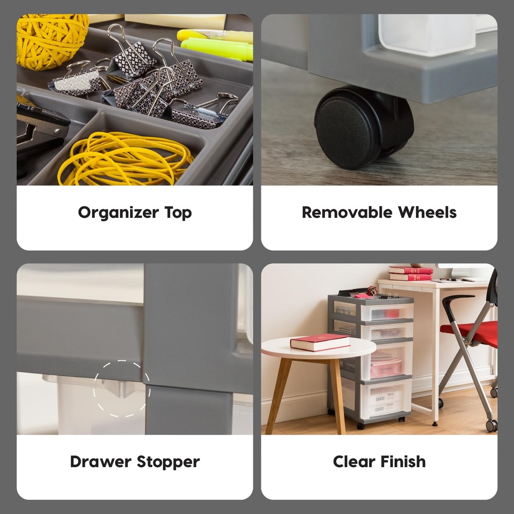 Usa Drawer Cart Offers A Practical Storage Solution For Any Room Of The Home.Organize And Store A Variety Of Household Items That Are Frequently Used In The Bedroom, Kitchen Pantry, Bathroom, Craft Room, Nursery, Or Dorm Room. It Could Be Used To Store Important Documents, Paper, Files, Or Stationaries At The Office.Clear Drawers Allow Contents To Be Easily Identified While Keeping Them Neat And Contained.Drawer Stops Prevent Drawers From Being Removed Accidentally. Use The Included Casters To Create A Rolling Storage Option Allowing You To Easily Transfer The Unit From Room To Room At Your Convenience. This Black Drawer Cart Has A Multi-Purpose Use And Is A Versatile Storage Option For Any Room Of The Home. Ideal For Controlling Clutter And Keeping Living Spaces Neat And Organized.The Cart Top Lid Is Designed To Organize Small Parts For Easier Accessibility. This Could Be Used To Place Pens, Paperclips, Paper And So Much More.Usa Plastic Drawer Carts Are Made In The Usa. All Of Our Products Are Green-Circle Certified. We Can Organize Our Home And Protect Our Earth At The Same Time. Multi-Purpose Oragnizer: Store A Variety Of Household Items That Are Frequently Used In The Office, Closet, Under-Desk, Kid’S Room, Craft Room, Nursery, Or Dorm Room Mobile Storage Solution: Removable Wheels Are Included, Can Be Attached To The Foot Of The Chest So You Can Move It Around Smoothly, Or Remove Them For Secured Placement Made In Usa: High-Quality Materials Are Used For Our Domestically-Manufactured Products. The Sturdy Plastic Makes These Durable, And The Smooth Glide Drawers Give You Easy Access To Contents. We Use Recyclable Material, So Our Products Are Green-Circle Certified Drawers : Drawer stops are attached on both sides of drawers to prevent drawers from falling out. Entire Dimensions: 14.25"D X 12.05"W X 25.94"H, Drawer dimensions: 12.5”D X 9.5”W X 2.94”H (Shallow) / 6.75”H (Deep).
