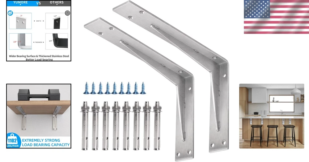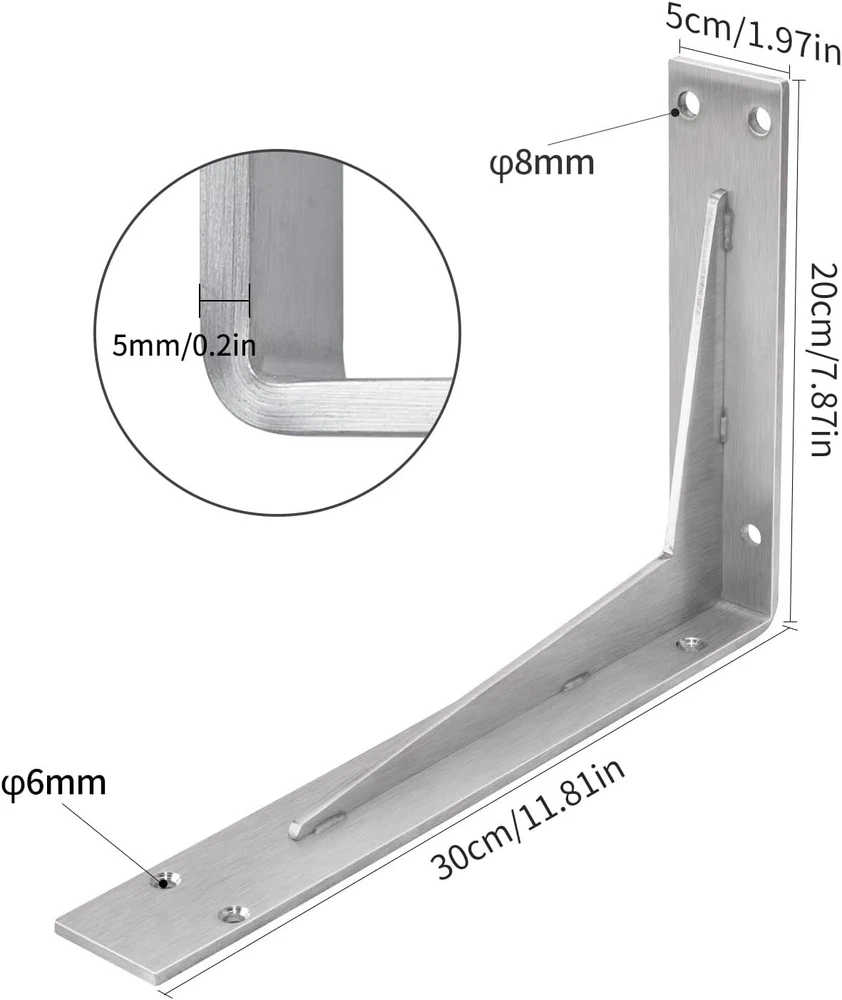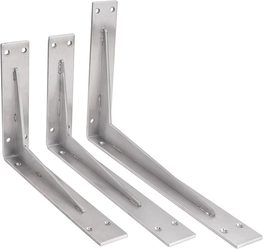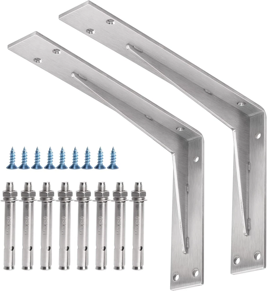 Number of Items in Set: 2 Required Tools: No Tools Required Features: Heavy Duty Shape: L-Shaped Maximum Weight per Shelf: 1102 lb Mounting: Wall Mounted Type: Bracket Shelf Door Mechanism: Open Face Item Weight: 5.86 lb Material: Stainless Steel Distance from Floor to Bottom: 2 in Packaging: Flat Pack Pattern: L-shaped Brackets Batteries Required?: No Finish: Brushed Size: 8x12 In Item Depth: 2 Inches Item Width: Heavy Duty Shelf Brackets Item Package Quantity: 1 Finish Type: Steel Color: Brushed Nickel Department: Adults Package Dimensions: 12.87 X 7.36 X 3.15 Inches Additional Parts Required: No Brand: Unbranded Thickness: 0.2 Inches UPC: Does not apply Number of Shelves: 1 Assembly Required: No Personalized: No gtin13: Does not apply Suitable For: Books Batteries Included?: No Item Length: Heavy Duty Shelf Brackets Style: Industrial Item Height: Heavy Duty Shelf Brackets Installation Method: Wall Mounted Room: Kitchen, Bathroom, Bedroom, Dining Room, Entryway, Home Office/Study, Living Room, Porch Set Includes: Shelf Brackets Maximum Weight Capacity: 1102 lb