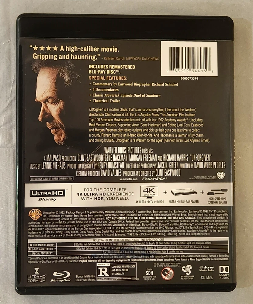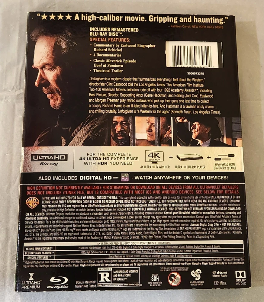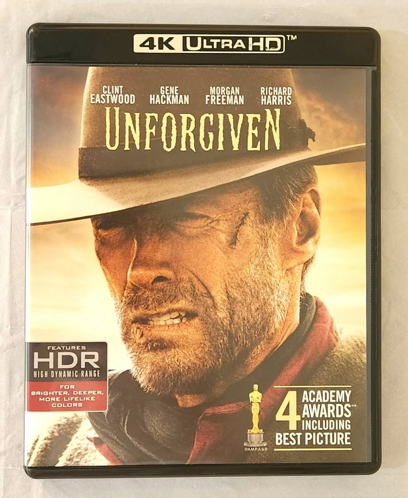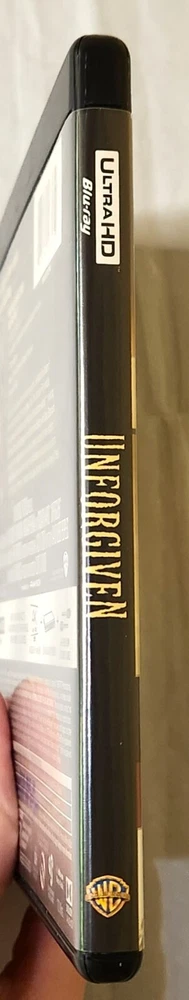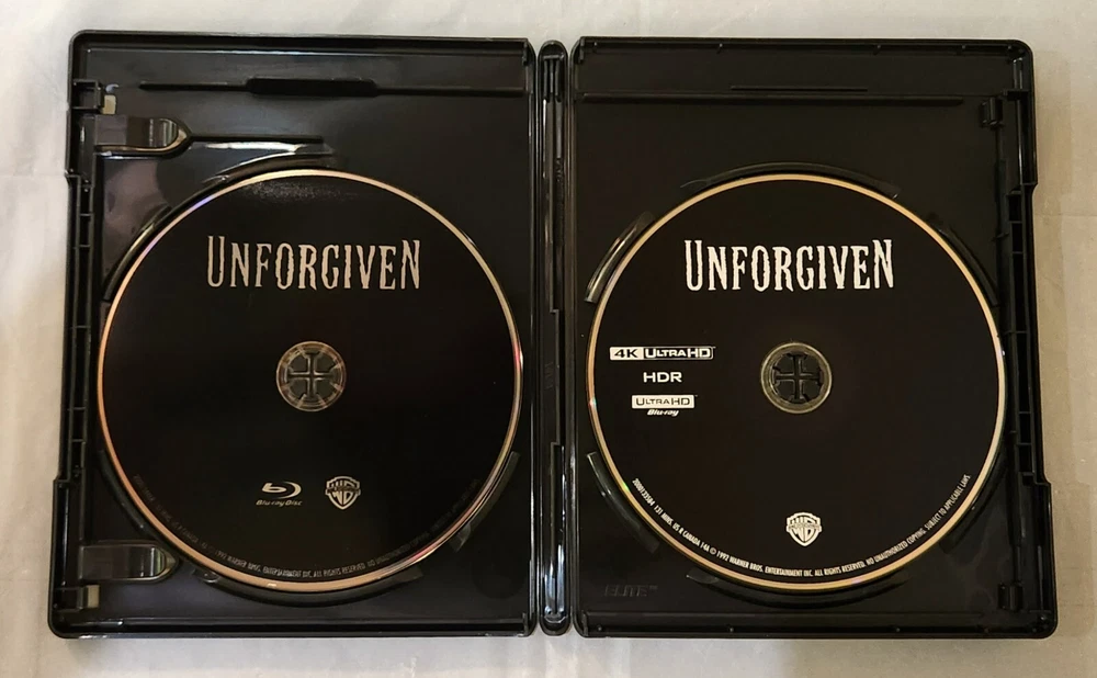This is the 4K UHD Blu-ray release of Unforgiven with the out of print slipcover. Includes: Slipcover, Blu-ray case, Movie on 4k Blu-ray, and movie on Blu-ray. Purchased new from Best Buy in 2017, opened and watched once, and then kept on media shelf in a smoke/vape-free home. Item will ship protected in a box.