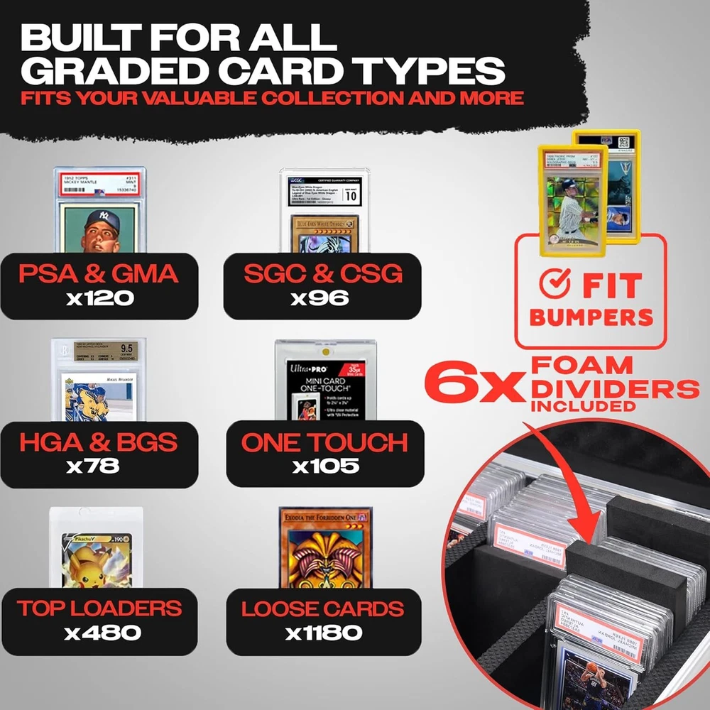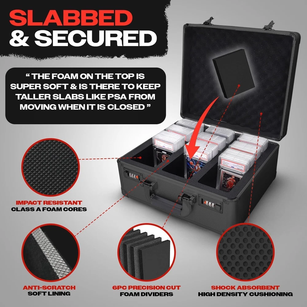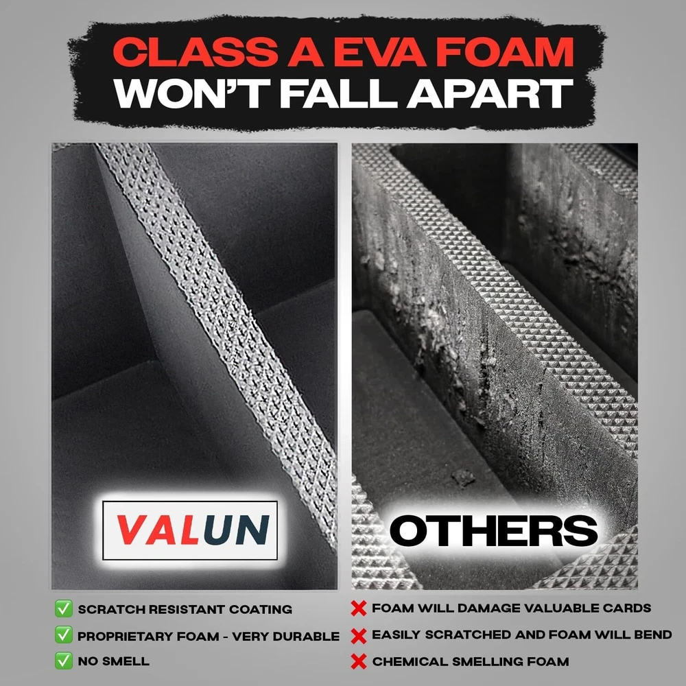 VALUN 120+ 3 ROW Graded Card Storage Box; Durable Sports, PSA Black Product Details Brand: VALUN Color: Black Material: Aluminum Special Feature: Graded, Storage Style: American Recommended Uses For Product: Card Storage Product Dimensions: 14"L x 7"W x 15"H Closure Type: Latch Water Resistance Level: Water Resistant Opening Mechanism: Latch Shape: Box Number of Items: 1 Unit Count: 1.0 Count Item Package Quantity: 1 Item Weight: 5.5 pounds Country of Origin: China Item model number: bq Manufacturer: A ✅ AMPLE CARD STORAGE; Designed for diverse storage needs, this trading card storage case from Valun holds 120 PSA & GMA graded cards, 96 SGC & CSG graded cards, 480 top loader card storage units & 78 HGA & BGS graded cards, 106 one touch graded card case items, or 1180 loose cards; It's the ultimate PSA card holder and sports card storage solution for serious collectors ✅ ULTRA TOUGH PROTECTION; With its aluminum exterior and padded foam interior, the Valun graded card storage box ensures your collection is safeguarded; Reinforced steel corners protect your TCG card storage box against accidental drops and damage; It’s the essential slab case for graded cards to keep your deck in pristine condition ✅ ADVANCED SECURITY FEATURES; Valun's sports card briefcase sets the storage case standard in security with its combination lock and two passcode system; Providing peace of mind for collectors, it's a secure card carrying case that offers peace of mind; When you need premium Pokemon card cases and sports card storage boxes, trust only Valun’s graded card case ✅ ORGANIZED STORAGE SOLUTION; The Valun organizer is thoughtfully designed for efficient organization of card cases and card boxes for sports cards; It's a versatile storage solution that keeps your collection orderly and easily accessible ✅ CLEVER FOAM INSERTS; Valun's sports boxes style collectible baseball trading card holder box features vertical foam inserts made from high quality foam that retains its form; These inserts provide additional protection and organization, making our trading card organizer an excellent choice for storing various card types