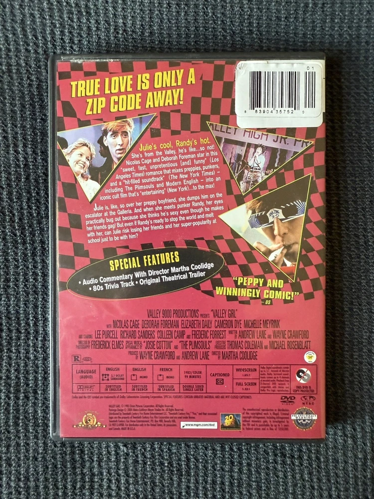 Relive the classic 1980s comedy with "Valley Girl" on DVD. This cult favorite stars Nicolas Cage and Deborah Foreman in a hilariously opposite world of yuppie Los Angeles. With a run time of 99 minutes, this DVD features the original English and French language tracks, and is rated R for mature audiences. Producers Andrew Lane, Thomas Coleman, and Wayne Crawford bring you this must-have addition to your comedy collection, directed by Martha Coolidge. Add "Valley Girl" to your DVD library today!