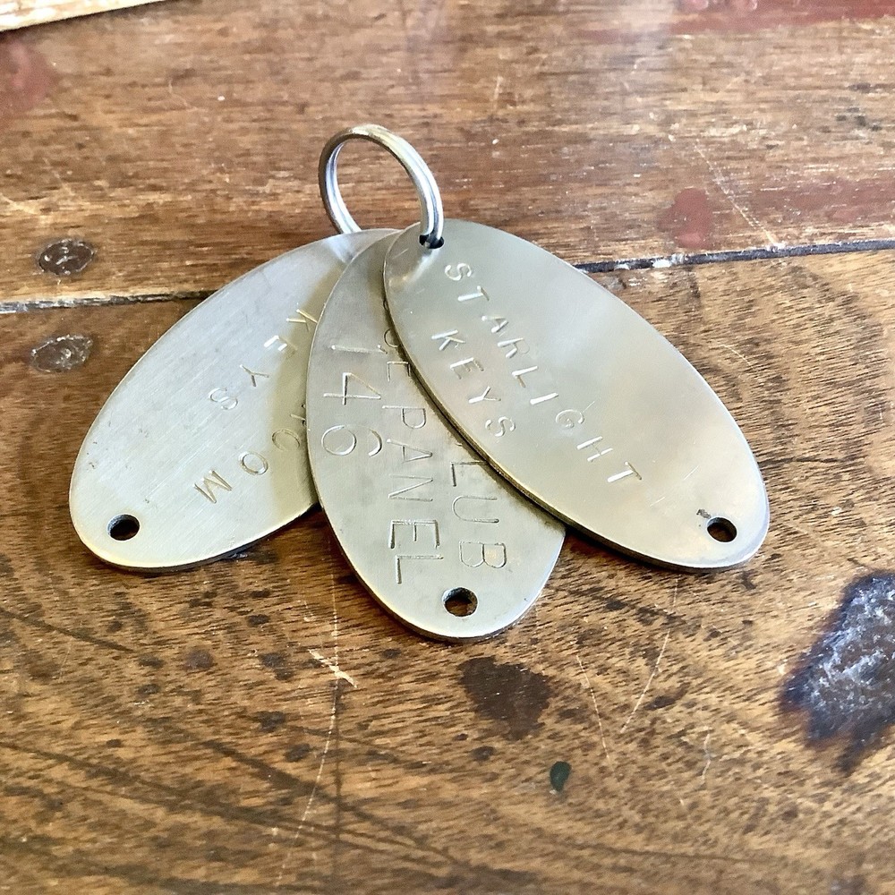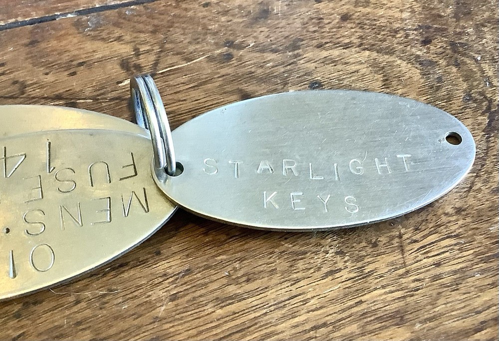 The Vintage 1970’s Starlight Key Ring with 3 Metal Oval Tags is a unique collectible piece perfect for those who appreciate retro nostalgia. Made of silver metal and featuring engraved details, this detachable keyring is a charming addition to any collection. The oval tags reference an establishment from the 1970s, making it a distinctive and eye-catching accessory for enthusiasts of vintage memorabilia. Way cool!