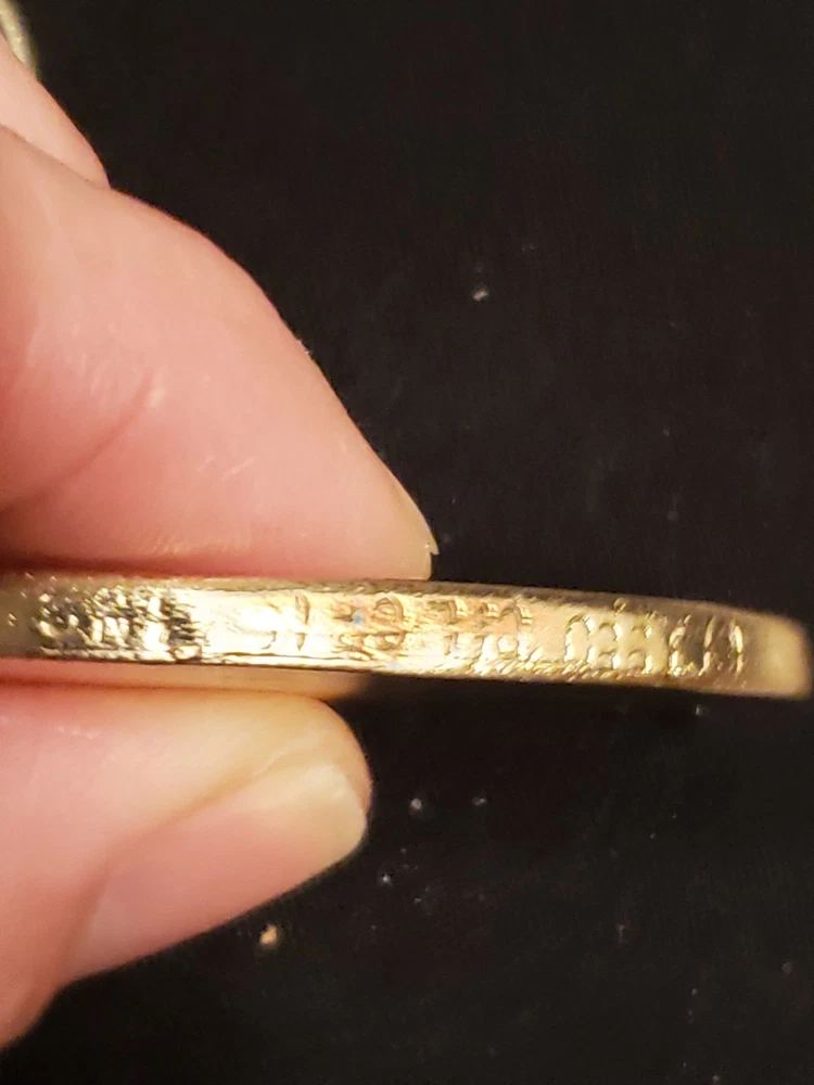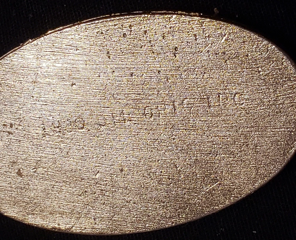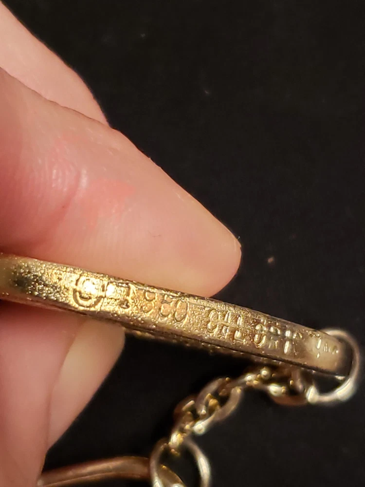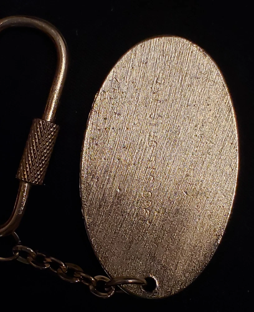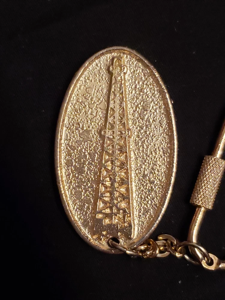 This vintage 1980 key chain features a gold color oil rig design with a detachable keyring and engraving. It is made of stainless steel and is part of the oil industry character family.