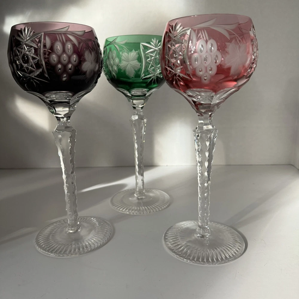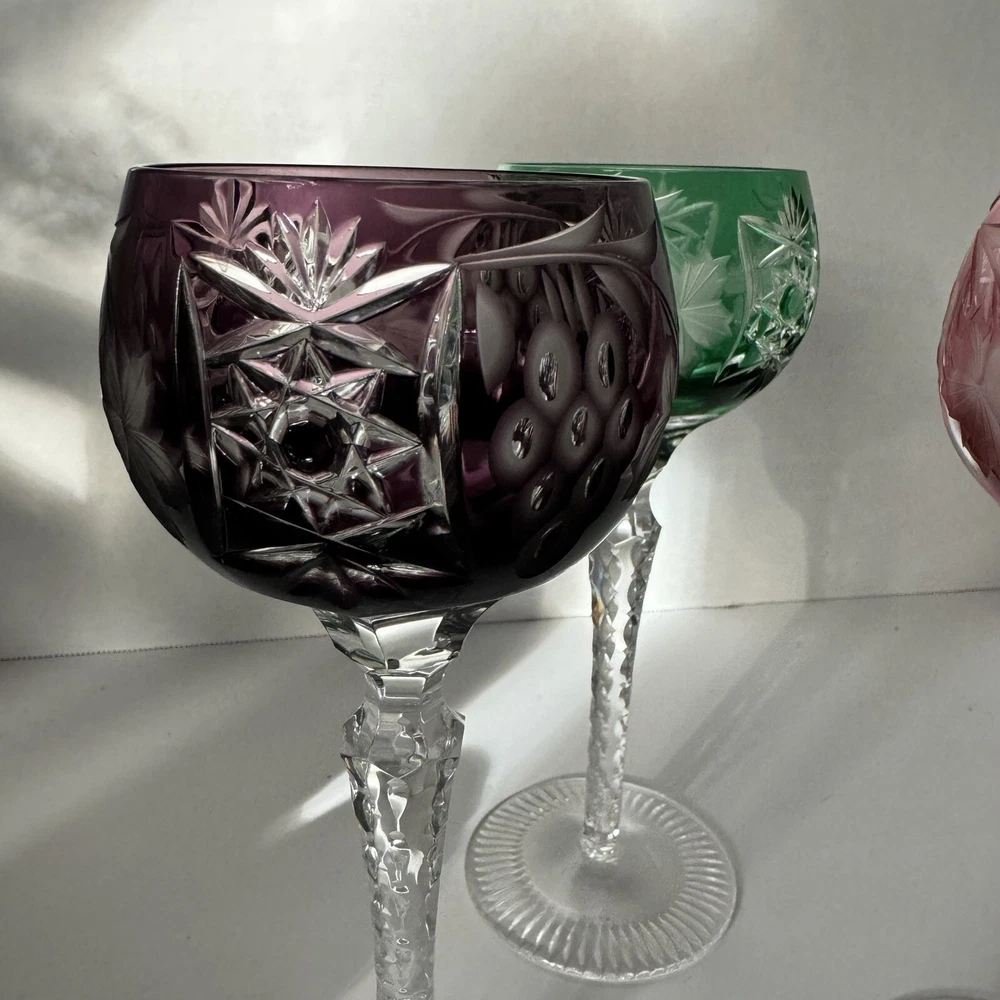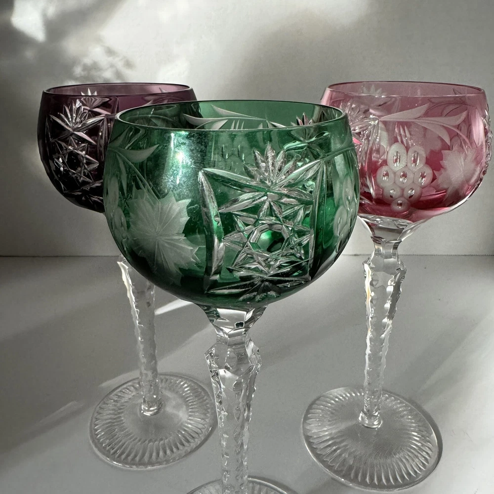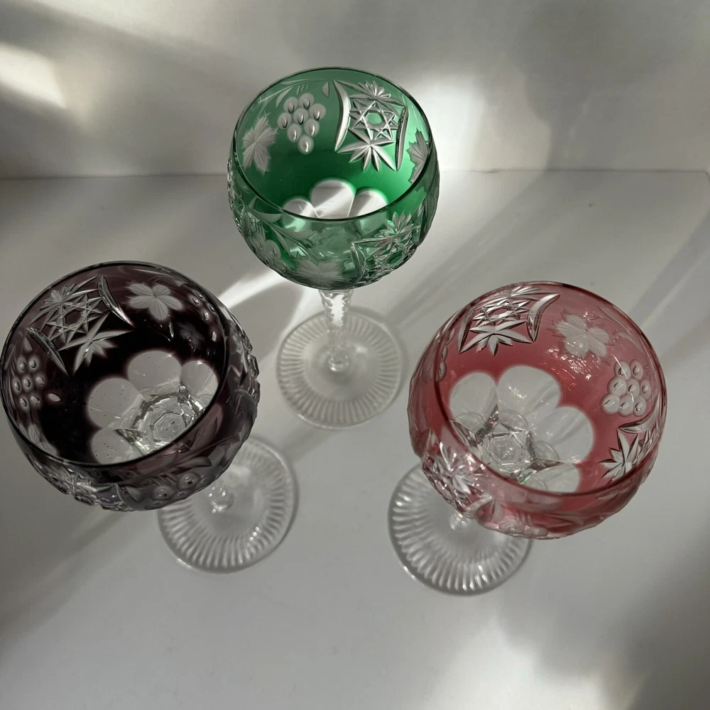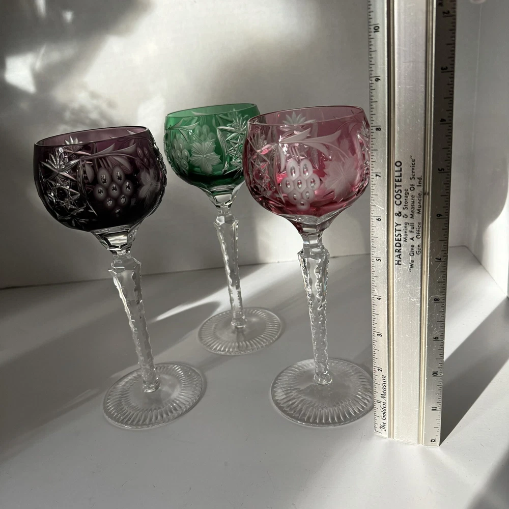 Title: Vintage Bohemian Crystal Wine Glasses Set of 3 - Multicolor Cut-to-Clear Stemware (Green, Pink, Purple) Description: Enhance your glassware collection with this exquisite set of three vintage Bohemian crystal wine glasses. Each glass features a stunning cut-to-clear design in vibrant green, pink, and purple, showcasing intricate patterns and craftsmanship. These glasses have beautifully detailed stems and bases, adding elegance and sophistication to any table setting. • Color: Green, Pink, Purple • Material: Genuine Bohemian crystal • Style: Cut-to-clear, vintage • Dimensions: Approximately 7-8 inches tall (see images with ruler for reference) • Condition: Excellent vintage condition, with no visible chips or cracks. These glasses have been well-preserved and are perfect for display or use. This set is perfect for collectors of fine glassware or those who appreciate the charm of vintage crystal. These glasses also make an ideal gift for special occasions such as weddings, anniversaries, or housewarmings. Keywords: Bohemian crystal, vintage glassware, cut-to-clear, wine glasses, colored glass, stemware, crystal goblets, European crystal, collectible glass, vintage barware Shipping: Carefully packaged to ensure safe delivery. Fast shipping available within the continental USA. Add a touch of vintage elegance to your home with these beautiful Bohemian crystal wine glasses! Thank you for visiting my store- please check it all my fabulous treasures. I list new pieces daily. If you are a returning customer please let me know as i love to reward repeat buyers with special coupons and treats xoxoxox