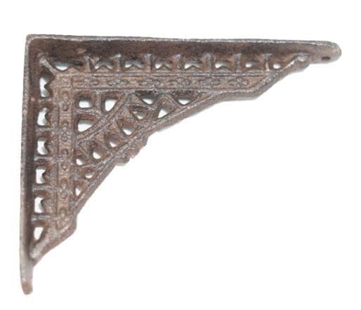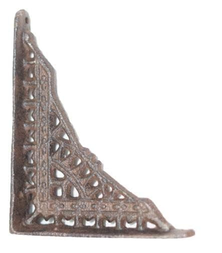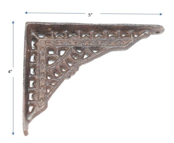Pack of 12 solid cast iron small shelf brackets. Each bracket measure 5" X 4". Rustic brown color for a truly vintage look. Perfect for restoration, accent pieces, farmhouse decor etc.! Mounting screws are not included. Pack of 12 small rustic cast iron brackets. Made durable from solid cast iron construction. Each bracket measure 5" X 4". Great for small wall mounted shelves. The rustic cast iron color provides a fantastic accent piece for any room or restoration project. Six predrilled holes (mounting screws not included) for easy and solid mounting