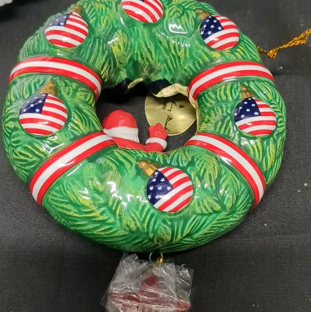 Celebrate the holiday season with this beautiful vintage Danbury Mint Patriotic Christmas Ornament. This ornament features a jolly Santa holding a wreath, perfect to add to your collection of ornaments. Made in 2016, this original piece is a must-have for any collector or enthusiast. The ornament is in great shape and comes in its original packaging, making it a perfect gift for a loved one or to keep in your collection. Add this Danbury Mint ornament to your collection today and enjoy its timeless beauty for years to come.