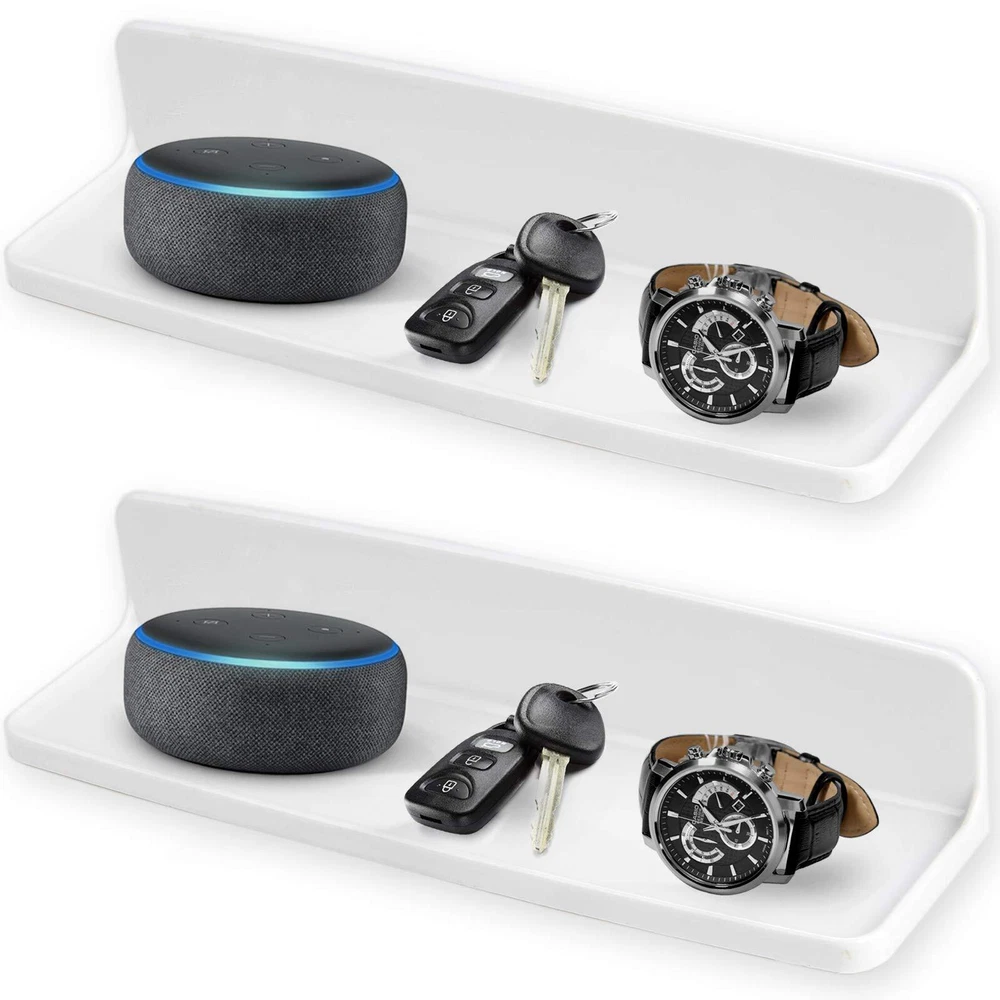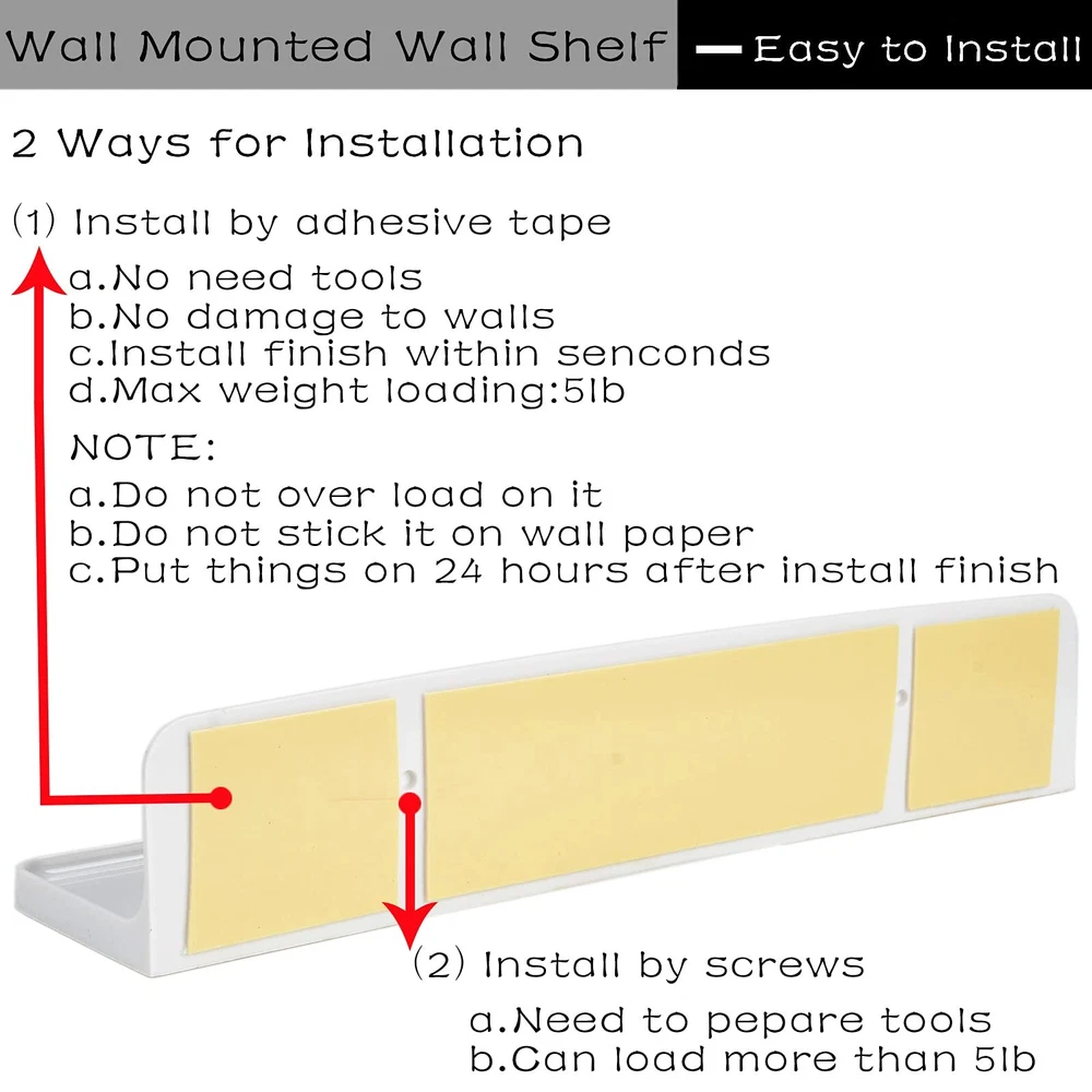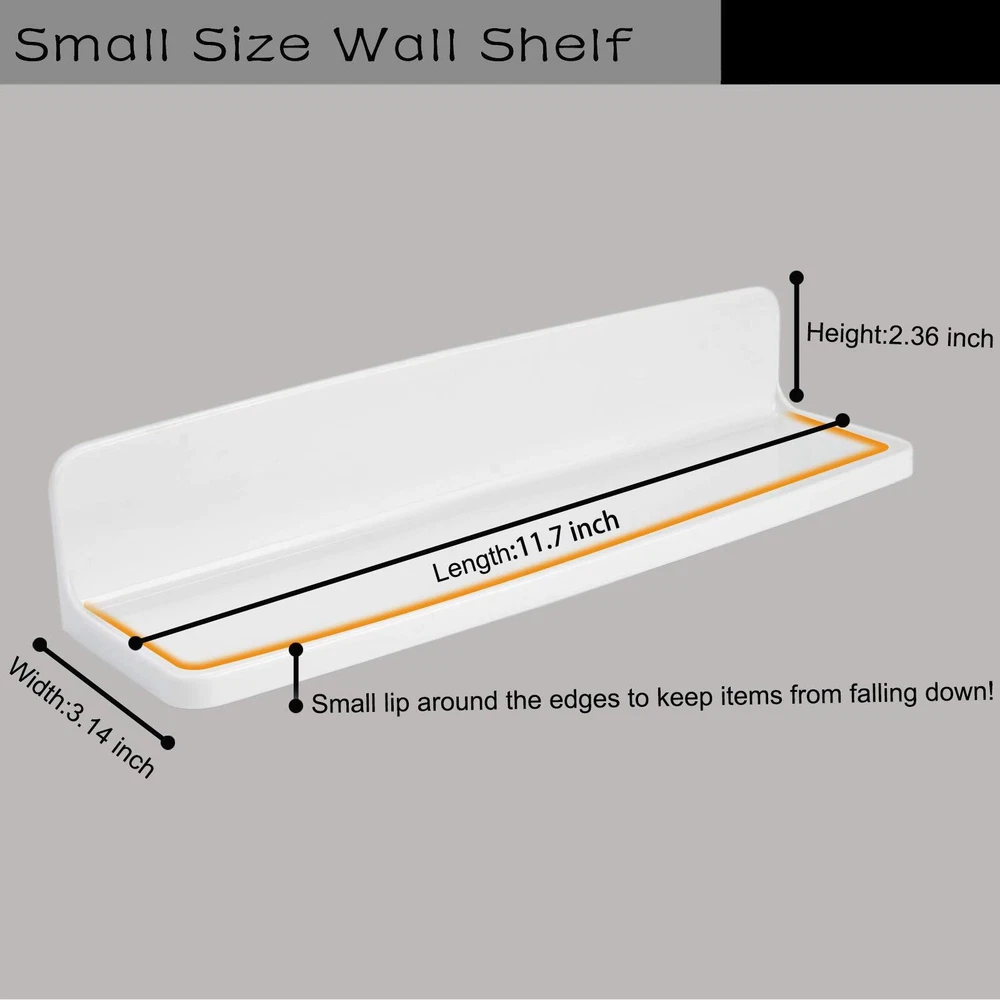 This stick on shelf is manufactured with premium ABS plastic material for durable and long-lasting use.The clean,simple design and style with comfortable texture will ensure its practicability and popularity among children or adults to storage or display small things such as mini toys,glasses,watch,keys,speaker etc.It's sturdy and not easy to break.It can not only be applied for practical use as storage shelf,it can be also used as a great decoration at home. Features: - Material: ABS Plastic. - Color: White. - Size: Approx. 29.7 * 8 * 6cm/ 11.7 * 3.14 * 2.36 inch(L*W*H). - High quality for durable and long-lasting use. - Perfect small floating wall shelf, ideal to be used for holding ,keys,remote,cosmetics and other trinkets. - Versatile in multiple environments:Kitchen,bedroom,bathroom,office. Package Including: 1 * Wall Mounted Wall Shelf 2 * Nails Note: Please do not stick it on the paper wall. Please make sure the wall is clean,dry and even before installation. Please put things in it 24 hours after install finishing for a better and longer weight-loading performance. Wall Mounted & Ample Space - Stick on wall shelf with minimalist design,enhances the storage space and works well in any setting.Suitable for entryway,bedroom,bathroom,kitchen,dorm room,kid's room,garage and any other place extra storage needed. Versatile - This small floating shelf is ideal to storage or display little items such as keys,phones,speaker,remote,glasses,wallet,cigarette,lighter,photo frame,watch,tooth brush,small handcraft and trinkets etc.Each shelf with 12 lbs loading capacity in max (Please DO NOT overload on it).You can also combine several shelves together in a single area to maximize your storage space. Easy and Fast Installation-2 ways for installation:(1) With double-sided adhesive pad,you can stick it on the wall in a few second without any tool,and no damage to the wall(DO NOT stick it on the paper wall).In this way,need to make sure the wall is dry,clean and even and the shelf can carry up to 12 lbs.(2) With nails,if you need a loading weight more than 12lbs,please prepare the tools and install it by nails through the reserved screw holes. Slim Size and Friendly To Use-With approx size:11.7"x 3.14"x 2.36"(L x W x H),this shelf is made from -piece mold of super strength ABS plastic,no rust,discolor,corrode and extremely durable to last for years.Flat finish,smooth rounded edges,functional yet straightforward small lip edge design helps ensure your items will not slip from the shelf. [No Worry Service] - We offer a 3-month worry-free for this small wall shelf to you and promise full payment back if you don’t like it.Just buy in confidence.