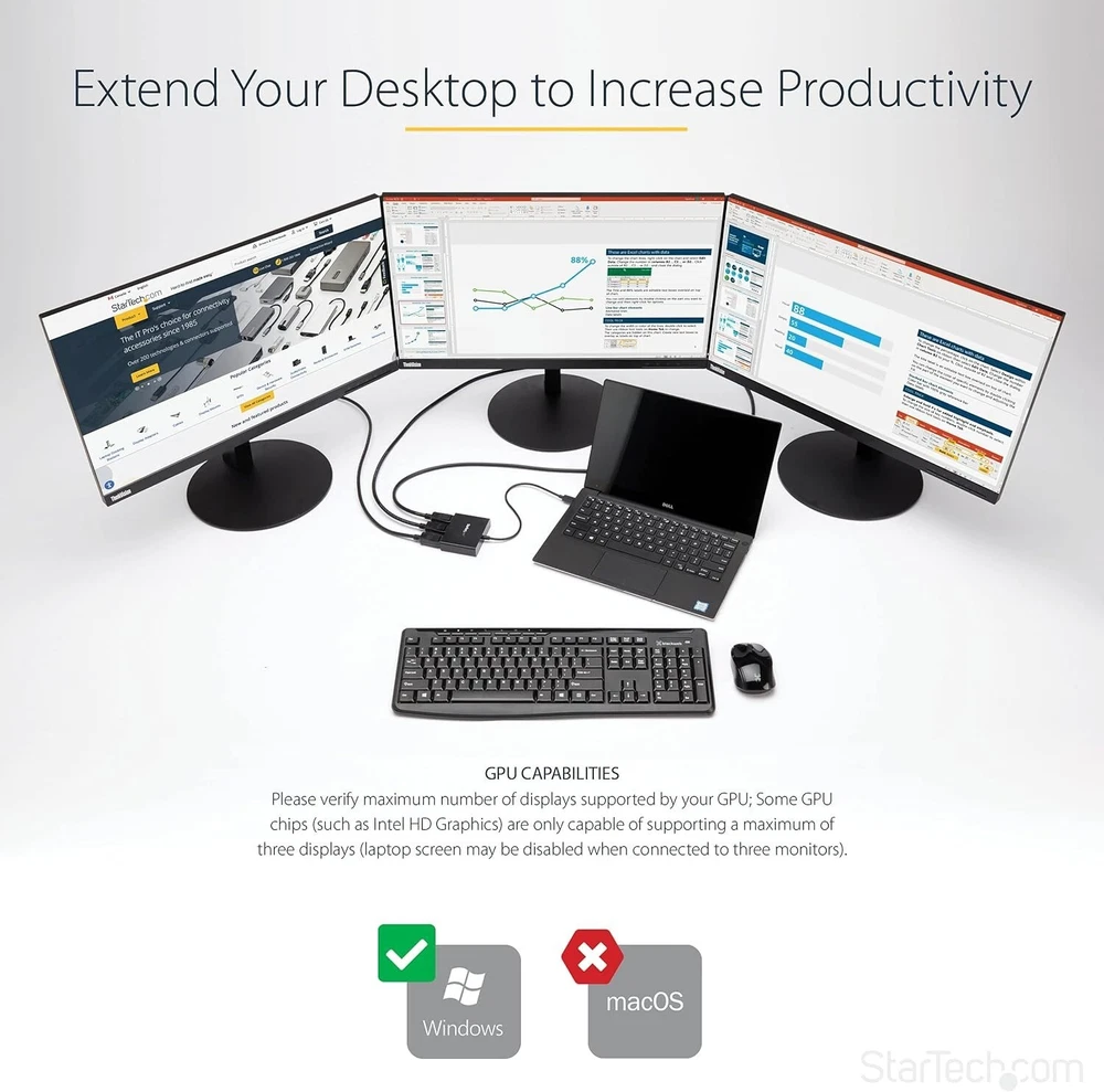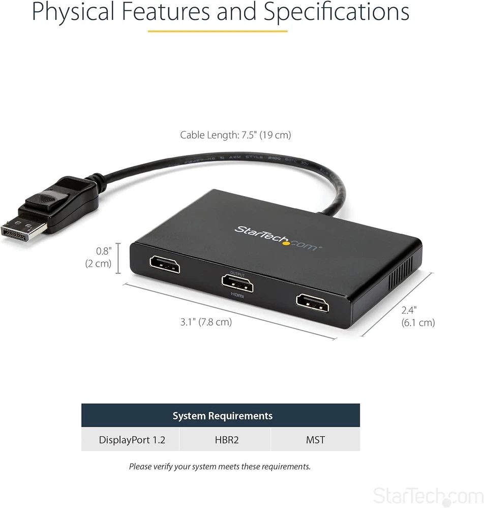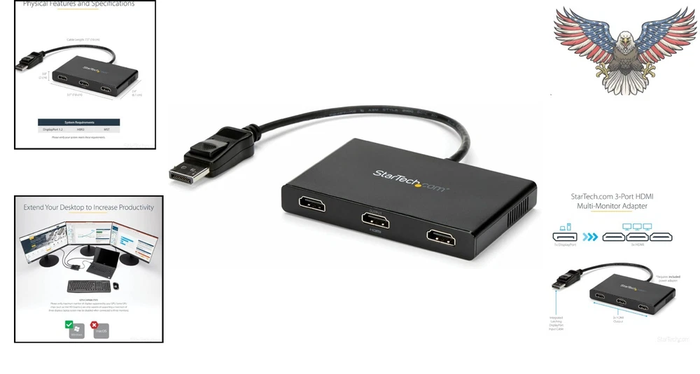 Windows-Compatible 3-Port DisplayPort to HDMI MST Splitter - Triple Monitors ‹ › ‹ › ‹ › ‹ › ‹ › ‹ › ‹ › ‹ › ‹ › Windows-Compatible 3-Port DisplayPort to HDMI MST Splitter - Triple Monitors -MULTI MONITOR ADAPTER FOR WINDOWS: DisplayPort to HDMI MST hub drives up to 3x HDMI monitors in extended or duplicate mode using a DP port on Windows desktop PCs or laptops; Not compatible with macOS -DISPLAY RESOLUTION: Multiple monitor DisplayPort to HDMI MST hub supports HD resolutions up to 3x 1080p 60Hz on three monitors, or dual 4K 30Hz on two monitors, or can support three ultrawide displays up to 2560x1080 -COMPATIBILITY: 3-Port DisplayPort to HDMI MST video splitter works with laptops, computers or desktop graphics cards; Requires host system with DP 1.2/HBR2/MST or later from HP, Dell & Lenovo and AMD, NVidia & Intel video cards -INCREASE PRODUCTIVITY: Increase productivity by extending your desktop at your workstation in the office/home office; MST technology uses your GPU/video card performance to deliver uncompressed video and use minimal system resources -GPU CAPABILITIES: Please verify maximum number of displays supported by your GPU; Some GPU chips (such as Intel HD Graphics) are only capable of supporting a maximum of three displays (laptop screen may be disabled when connected to three monitors) Features: Connect up to three HDMI monitors to a DisplayPort 1.2 equipped Windows laptop or desktop Supports HD resolutions and dual 4K displays Compatible with laptops, computers, and desktop graphics cards Plug-and-play installation for hassle-free setup Benefits: Enhance productivity by multitasking with multiple screens Configure displays for any environment with extended or duplicate modes Enjoy high-quality video without draining system resources Perfect for graphic design, gaming, and medical imaging applications Why choose our DisplayPort to HDMI MST Splitter? Experience seamless multitasking and enhanced productivity with our Windows-compatible 3-Port DisplayPort to HDMI MST Splitter. With support for multiple displays and high resolutions, this splitter is ideal for various applications such as graphic design, gaming, and more. Don't compromise on performance - choose our MST splitter for unrivaled video quality and ease of setup. Upgrade your workstation with the ultimate multitasking solution - order now! Shipping Free & Fast Shipping - We offer free shipping to most of the USA with a normal delivery time of 3-7 days. However, due to the current situation, additional delivery time (up to 3 weeks) may be required for some items. Alternative Carriers - We may use alternative carriers (e.g. USPS, FedEx, UPS, etc.) to ensure your package arrives safely and on time. Due to the use of multiple carriers, we are unable to provide a tracking number automatically. Handling Time - Orders are processed and shipped within 1-2 business days of receiving cleared payment. Shipping Restrictions - Shipping to Alaska, Hawaii, Puerto Rico, Guam, and other US territories may incur shipping charges or delivery restrictions. Please contact us before ordering, or your order can be refunded/cancelled. State Restrictions - There may be restrictions based on your state of purchase. For example, certain items may not be shipped to California due to state regulations. Contact for Tracking Updates - If you require tracking updates or have any concerns about the delivery of your order, please feel free to contact us, and we will be happy to assist you. Return 30-Day Hassle-Free Returns - We want you to be completely satisfied with your purchase. If you are not, you can return the item within 30 days of receiving it for a full refund or exchange. Easy Return Process - To start a return, simply contact us and we will provide you with a prepaid return shipping label and detailed instructions. Restocking Fee - There are no restocking fees for returns. However, the buyer is responsible for return shipping costs if the return is not due to a seller's error. Refund Processing Time - Refunds will be processed within 5 business days of receiving the returned item in its original condition. Payment We accept all major credit cards, PayPal, and Apple Pay for your convenience. Your payment information is secure and encrypted to ensure a safe and seamless transaction. Please complete your payment within 3 days of purchase to avoid any delays in shipping. Feedback Your feedback is extremely important to us. We strive to provide the best products and customer service possible. If you are satisfied with your purchase, please take a moment to leave us a positive review. If you have any concerns or issues with your order, please contact us before leaving negative feedback. We are committed to resolving any problems and ensuring your satisfaction. Contact Us If you have any questions or concerns, please feel free to reach out to our customer support team. You can contact us through the eBay messaging system. We are available Monday to Friday, 9:00 am to 5:00 pm EST, and we will do our best to respond to your inquiry within 24 hours. Thank you for supporting our small family business! MPN: DisplayPort_to_HDMI_Multi_Monitor_Adapter Model: DisplayPort to HDMI Multi Monitor Adapter Unit Quantity: 1 Connector(s) B: HDMI Standard Female Connector A: DisplayPort Male Features: DisplayPort to HDMI Multi Monitor Adapter Brand: Unbranded Type: DisplayPort Adapter Connection Split/Duplication: 1 : 3 Cable Length: Not Set Color: Black
