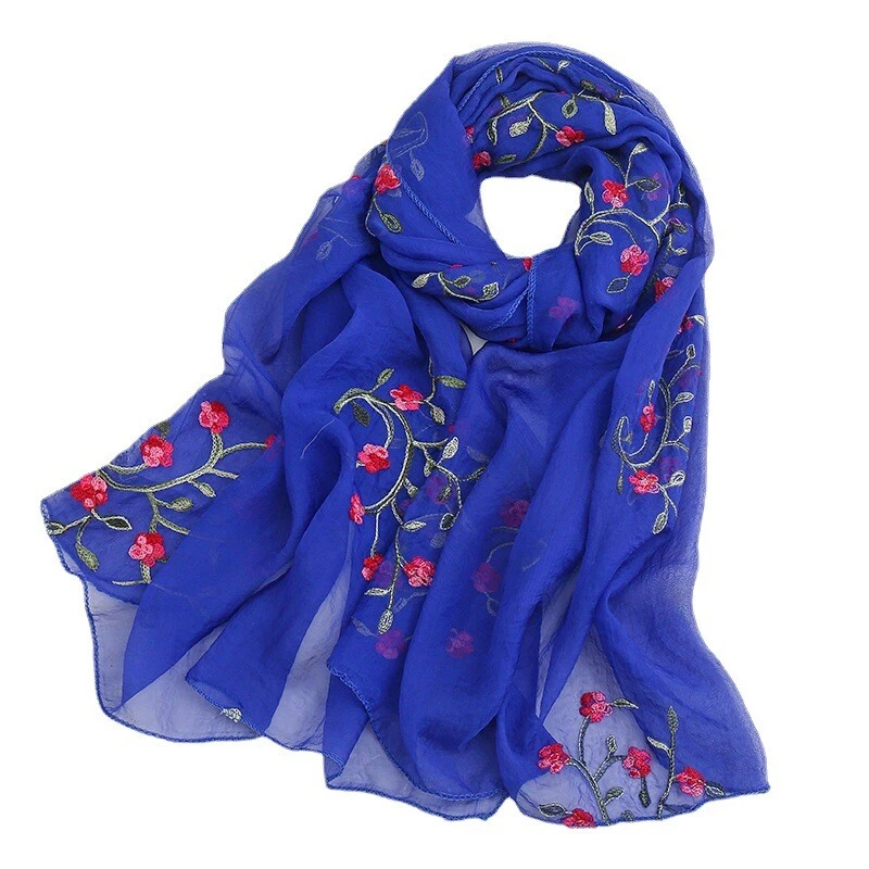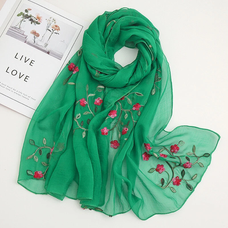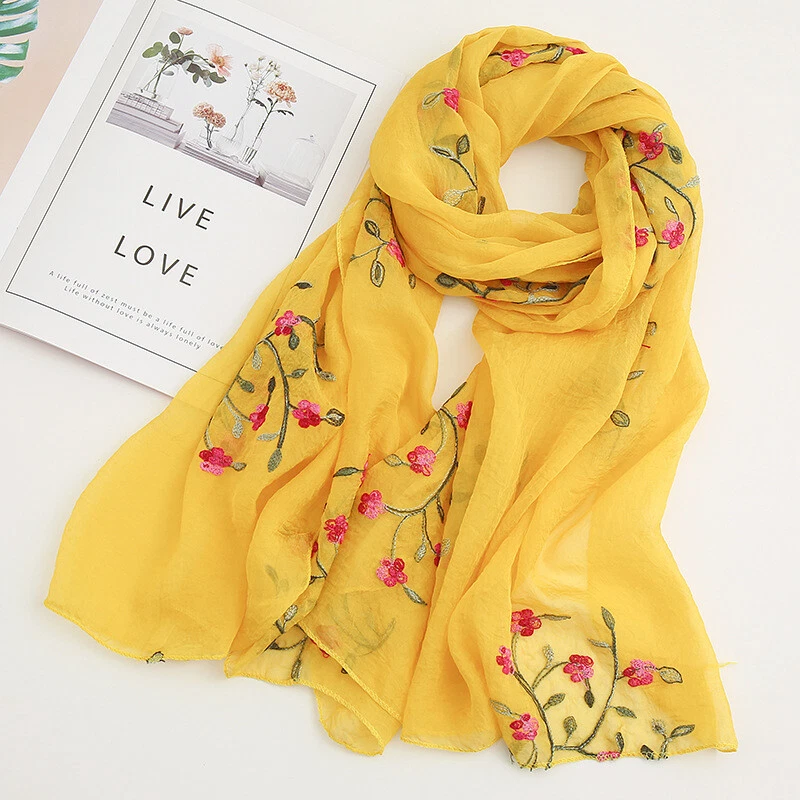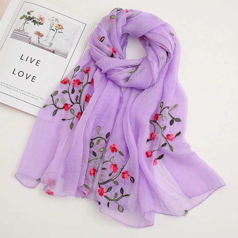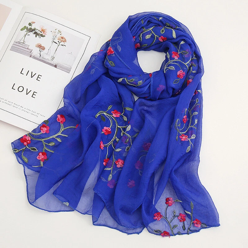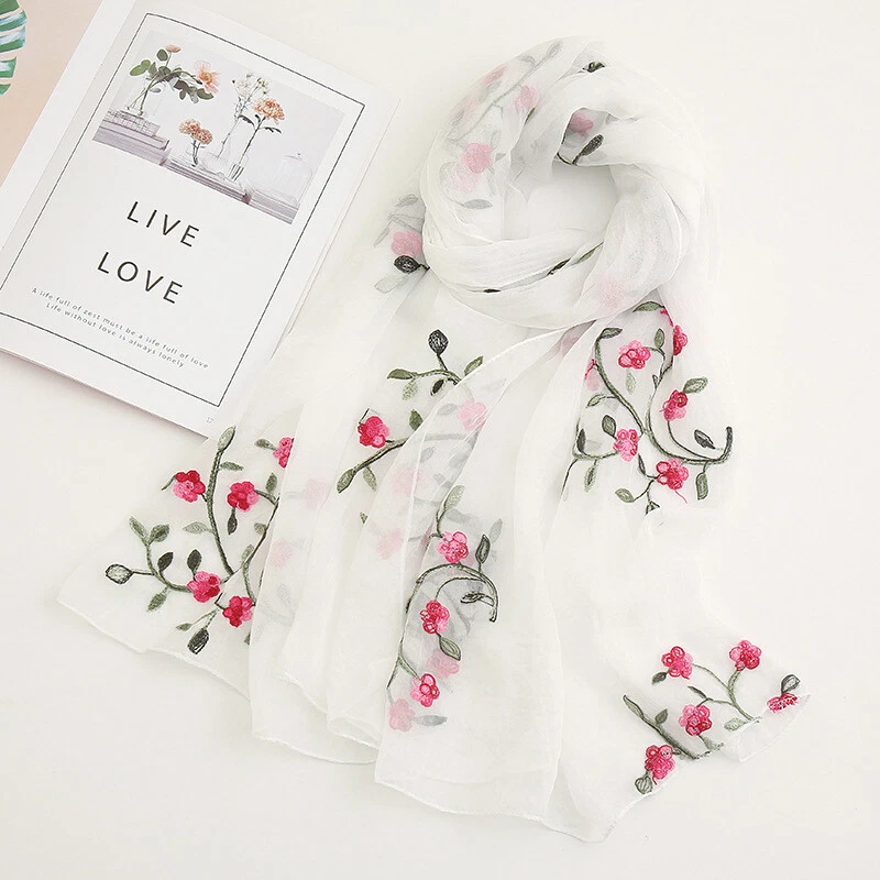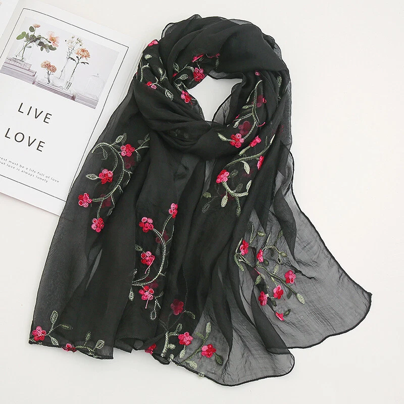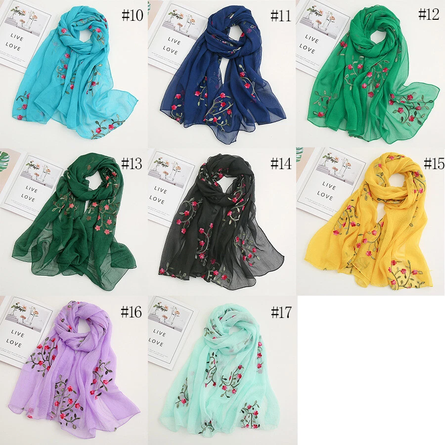 Womens Flower Embroidery Soft Long Neck Scarf Wrap Shawl Stole Scarves Chiffon