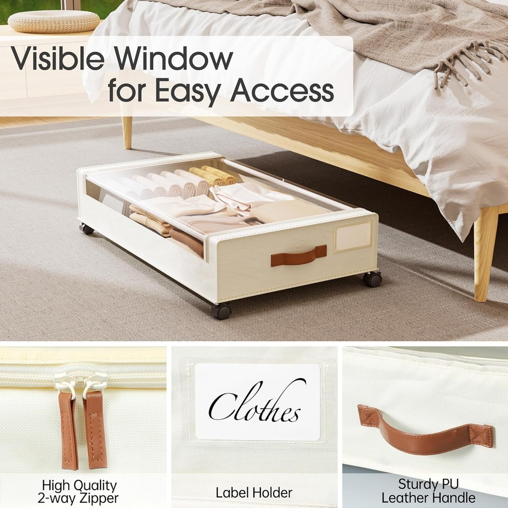 Brand Yecaye Color Beige Material Oxford Fabric and Metal Special Feature Wheeled Style Modern About this item Hold Up to 66lbs: Yecaye under bed storage with wheels is made of high quality 600D oxford fabric and sturdy metal frame, can hold up to 66 lbs, stronger than other fragile metal mesh, spacious capacity perfect for storing clothes, toys, books, shoes and other heavy items also won't compromise stability and durability 360°Rotating Silent Wheels: Say goodbye to constantly carrying heavy storage boxes around your house.This under bed rolling storage comes with 4 x 360°rotating wheels,two of which have locking function.When you need it to remain stationary, just press the locking mechanism gently. No matter how full the cart is, adults and children can easily slide on the floor and carpet Clear Window & Label: Our rolling underbed storage bins are equipped with a Clear window, you can clearly see the stored items, say goodbye to the trouble of misplacing items. Additionly, the included label is great for labeling contents, allowing you to quickly identify and find the item you're looking for without having to open multiple containers or boxes Versatility: Under bed shoe storage dimensions:30.71 x 16.93 x 6.69 inches (with wheels), (applicable under-bed height > 7in), large capacity exceeds your expectation to store more daily items. It can be placed under beds, sofas, tables, and closets to maximize unused space. In addition, this under bed storage drawers can be folded up when not in use, perfect for small families and college dorms that need extra storage space Easy to Install: This rolling storage bin is designed to easy installation and hassle free.Including user-friendly instruction and require minimal effort to set up, which also means you can quickly install and utilize the underbed storage space,saving valuable time and effort,ideal for bed rotting, the blind, and seniors with mobility issues Technical Details Brand Yecaye Color Beige Material Oxford Fabric and Metal Special Feature Wheeled Style Modern Recommended Uses For Product For Clothes Storage Product Dimensions 30.7"L x 16.9"W x 6.7"H Capacity 45 Liters Opening Mechanism Slide Shape Rectangular Pattern Plain Number of Items 2 Storage Volume 45 Liters Number of Compartments 1 Unit Count 2.0 Count Item Package Quantity 1 Maximum Weight Recommendation 66 Pounds Manufacturer YECAYE Item Weight 7.87 pounds Size 2 Pack Special Features Wheeled Batteries Required? No